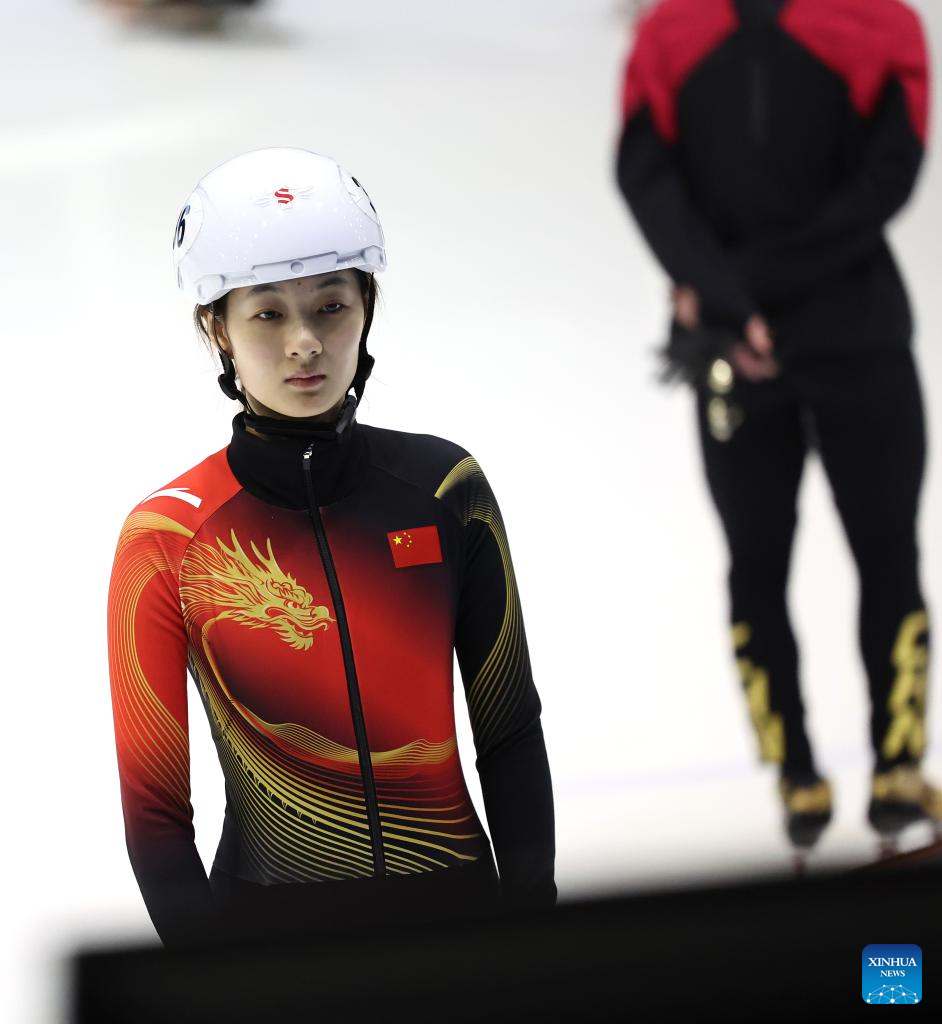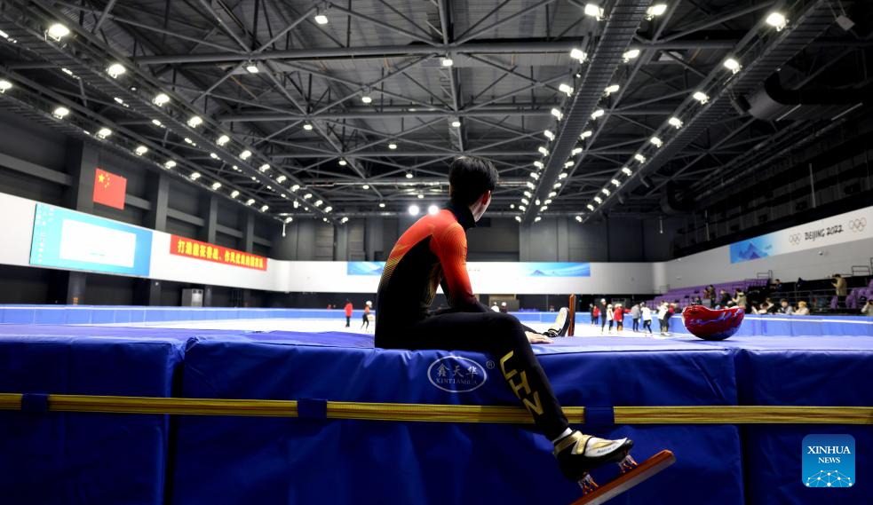 Chinese short track speed skater Wang Xinran reacts during a training session ahead of the upcoming Milan-Cortina 2026 Winter Olympics in Beijing, China, Jan. 29, 2026. (Xinhua/Li Ming)