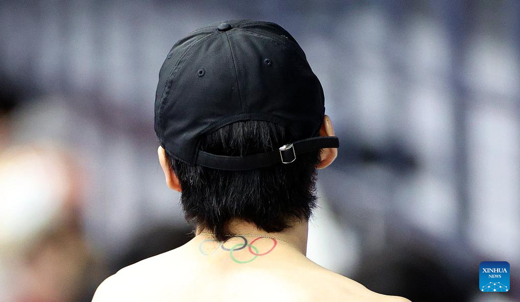 This photo taken on Jan. 29, 2026 shows the Olympic rings tattoo on the neck of Chinese short track speed skater Lin Xiaojun during a training session ahead of the upcoming Milan-Cortina 2026 Winter Olympics in Beijing, China. (Xinhua/Zhang Chen)