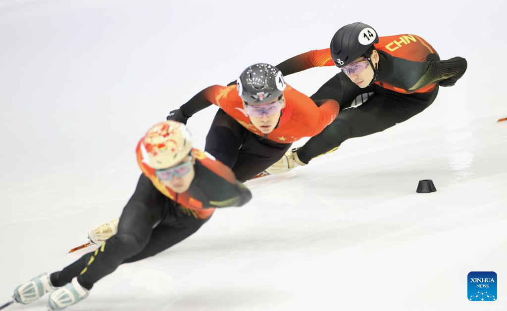 Chinese short track speed skater Zhang Chutong (2nd R) leaves during a training session ahead of the upcoming Milan-Cortina 2026 Winter Olympics in Beijing, China, Jan. 29, 2026. (Xinhua/Li Ming)