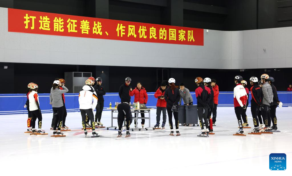 Skaters of China's short track speed skating team take part in a training session ahead of the upcoming Milan-Cortina 2026 Winter Olympics in Beijing, China, Jan. 29, 2026. (Xinhua/Li Ming)