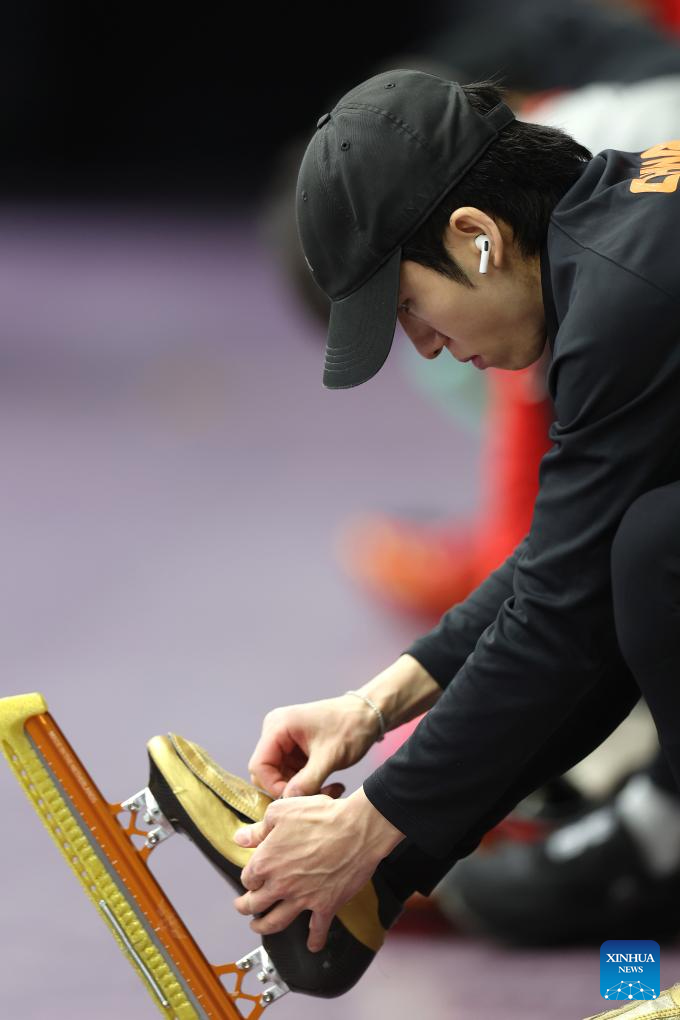 Chinese short track speed skater Lin Xiaojun puts on his skates before attending a training session ahead of the upcoming Milan-Cortina 2026 Winter Olympics in Beijing, China, Jan. 29, 2026. (Xinhua/Zhang Chen)