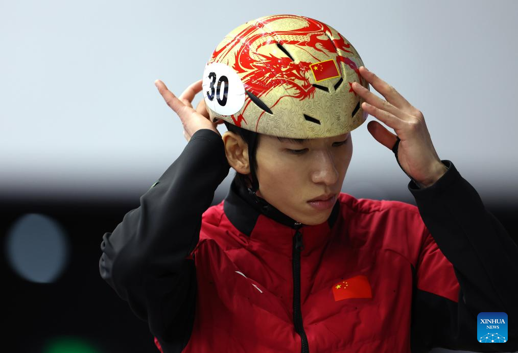 Chinese short track speed skater Lin Xiaojun puts on helmet during a training session ahead of the upcoming Milan-Cortina 2026 Winter Olympics in Beijing, China, Jan. 29, 2026. (Xinhua/Li Ming)
