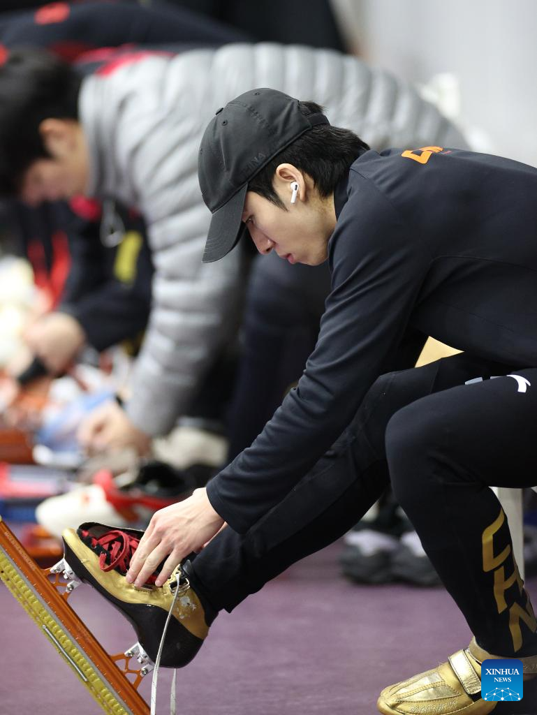 Chinese short track speed skater Lin Xiaojun ties up shoes during a training session ahead of the upcoming Milan-Cortina 2026 Winter Olympics in Beijing, China, Jan. 29, 2026. (Xinhua/Li Ming)