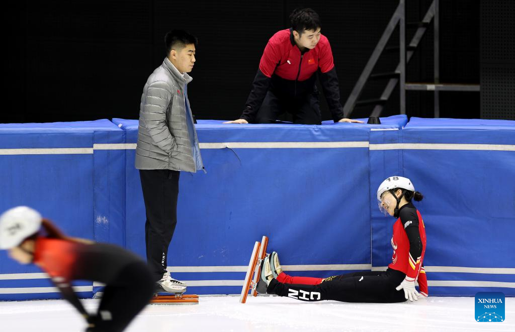 Chinese short track speed skater Gong Li falls during a training session ahead of the upcoming Milan-Cortina 2026 Winter Olympics in Beijing, China, Jan. 29, 2026. (Xinhua/Zhang Chen)