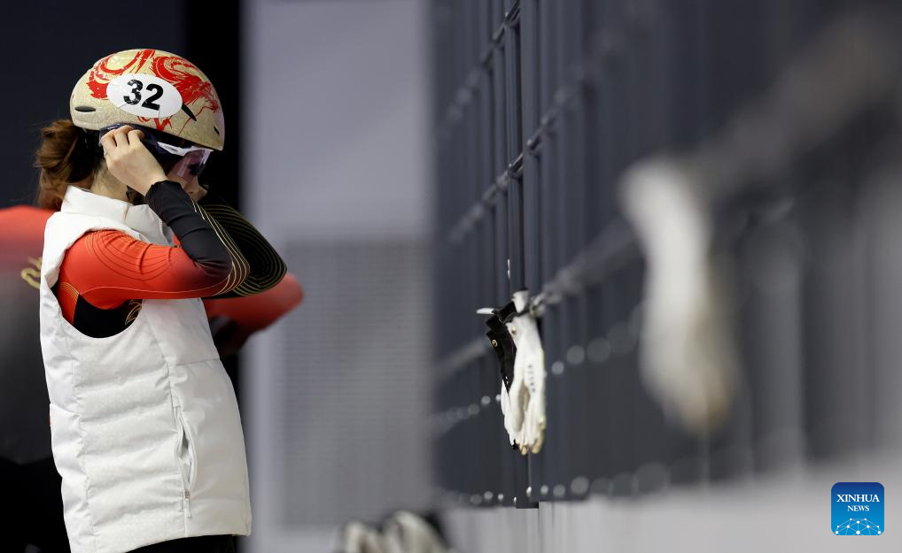 Chinese short track speed skater Yang Jingru puts on helmet during a training session ahead of the upcoming Milan-Cortina 2026 Winter Olympics in Beijing, China, Jan. 29, 2026. (Xinhua/Li Ming)