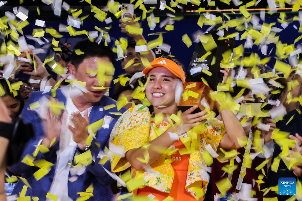 Camila Osorio of Colombia raises the champion's trophy during the awarding ceremony for the women's singles at the WTA Philippine Women's Open in Manila, the Philippines, Jan. 31, 2026. (Xinhua/Rouelle Umali)
