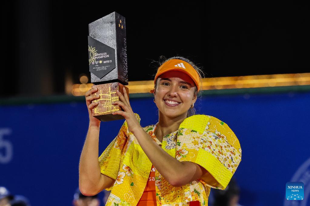 Camila Osorio of Colombia holds the champion's trophy during the awarding ceremony for the women's singles at the WTA Philippine Women's Open in Manila, the Philippines, Jan. 31, 2026. (Xinhua/Rouelle Umali)