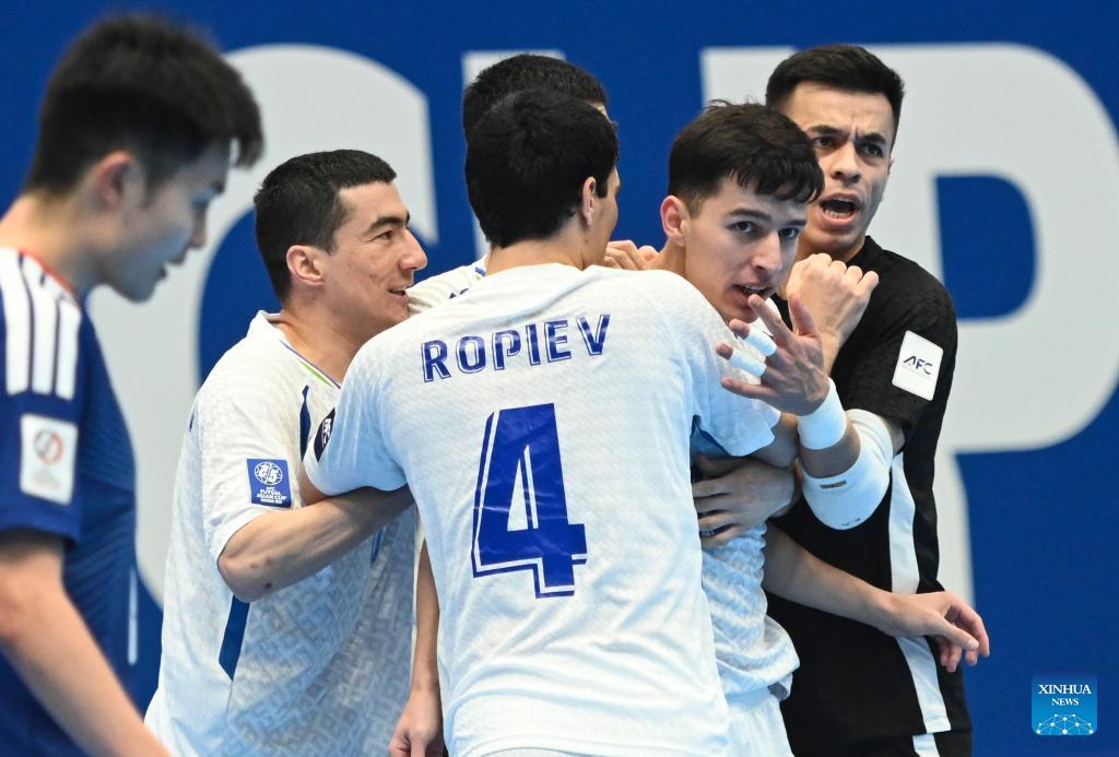 Fakhriddinov Shakhram (2nd R) of Uzbekistan and teammates celebrate during the group C match between Japan and Uzbekistan at the AFC Futsal Asian Cup 2026 in the Indonesia Arena stadium, Jakarta, Indonesia, Feb. 1, 2026. (Xinhua/Zulkarnain)