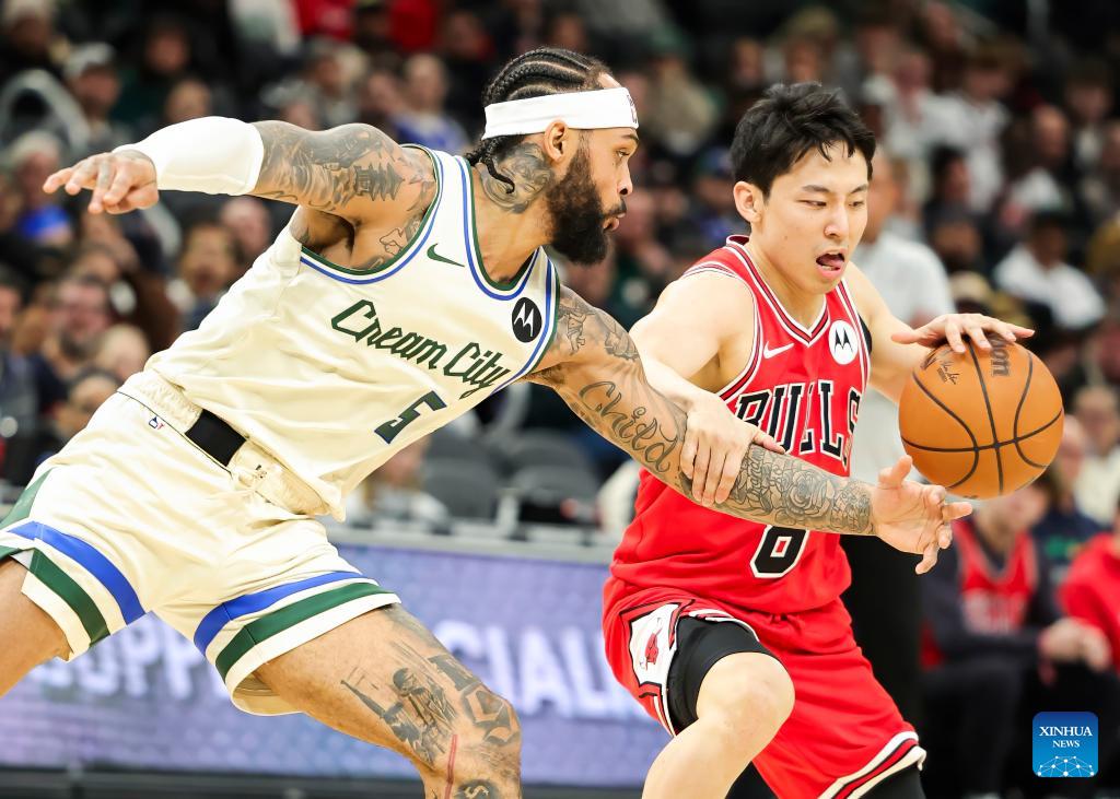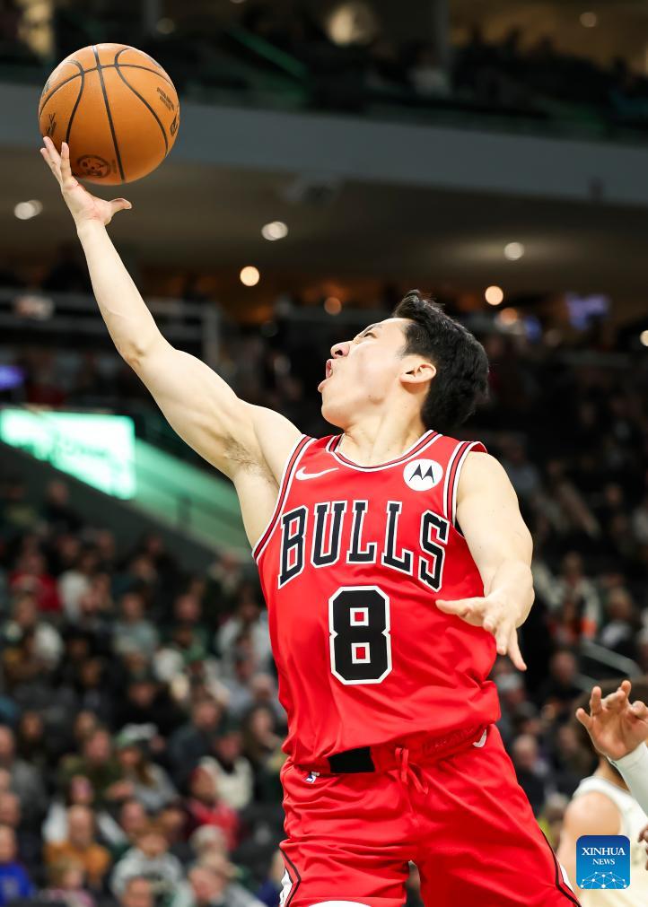 Chicago Bulls' Kawamura Yuki drives to the basket during the 2025-2026 NBA regular season basketball game between Milwaukee Bucks and Chicago Bulls in Milwaukee, the United States, on Feb. 3, 2026. (Photo by Joel Lerner/Xinhua)