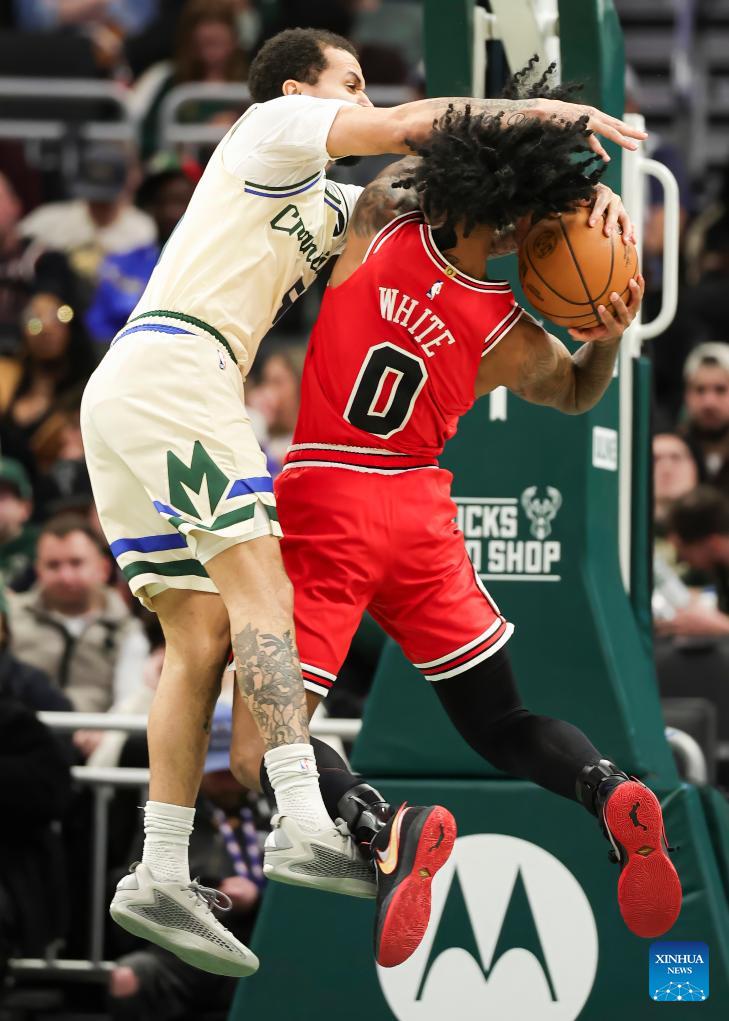 Chicago Bulls Coby White (top) drives to the basket during the 2025-2026 NBA regular season basketball game between Milwaukee Bucks and Chicago Bulls in Milwaukee, the United States, on Feb. 3, 2026. (Photo by Joel Lerner/Xinhua)
