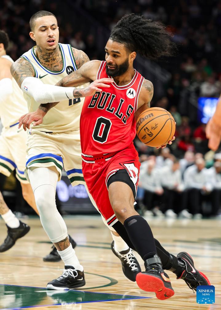 Chicago Bulls' Coby White (R) drives the ball during the 2025-2026 NBA regular season basketball game between Milwaukee Bucks and Chicago Bulls in Milwaukee, the United States, on Feb. 3, 2026. (Photo by Joel Lerner/Xinhua)