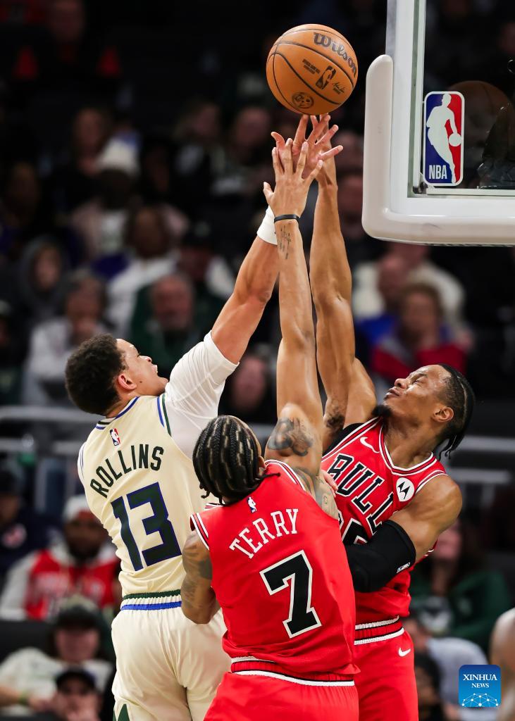 Milwaukee Bucks' Ryan Rollins (L) drives to the basket as Chicago Bulls' Dalen Terry (C) and Isaac Okoro defend during the 2025-2026 NBA regular season basketball game between Milwaukee Bucks and Chicago Bulls in Milwaukee, the United States, on Feb. 3, 2026. (Photo by Joel Lerner/Xinhua)