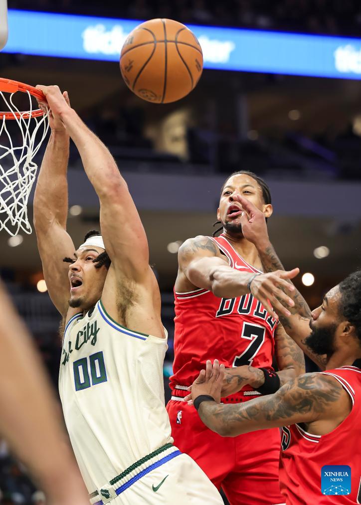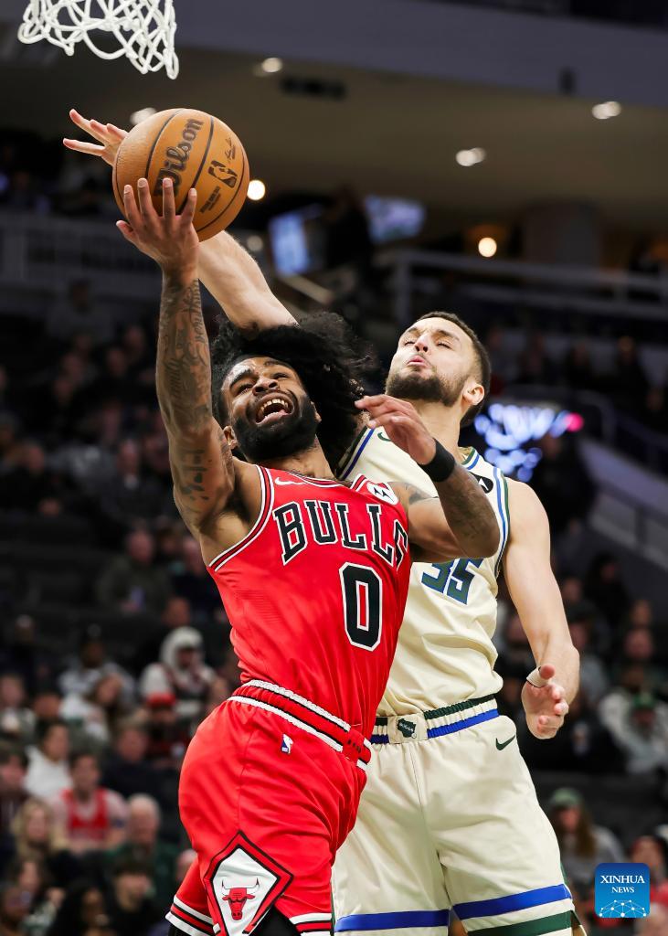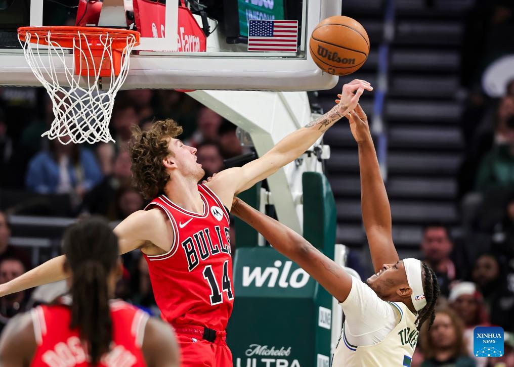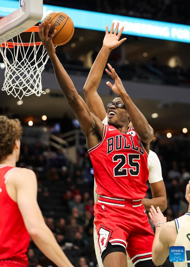 Chicago Bulls' Jalen Smith (R) drives to the basket during the 2025-2026 NBA regular season basketball game between Milwaukee Bucks and Chicago Bulls in Milwaukee, the United States, on Feb. 3, 2026. (Photo by Joel Lerner/Xinhua)