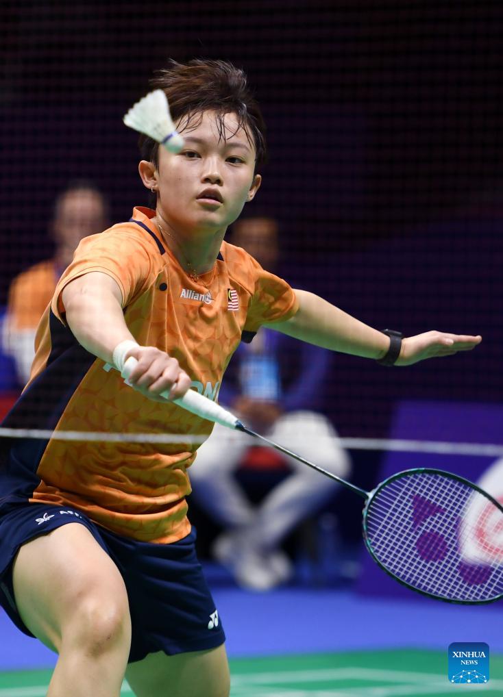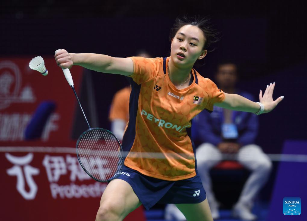 Oo Shan Zi of Malaysia hits a return in the women's singles match against Yuan Anqi of China during the women's team Group W match between China and Malaysia at Badminton Asia Team Championships 2026 in Qingdao, east China's Shandong Province, Feb. 4, 2026. (Xinhua/Li Ziheng)