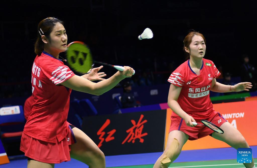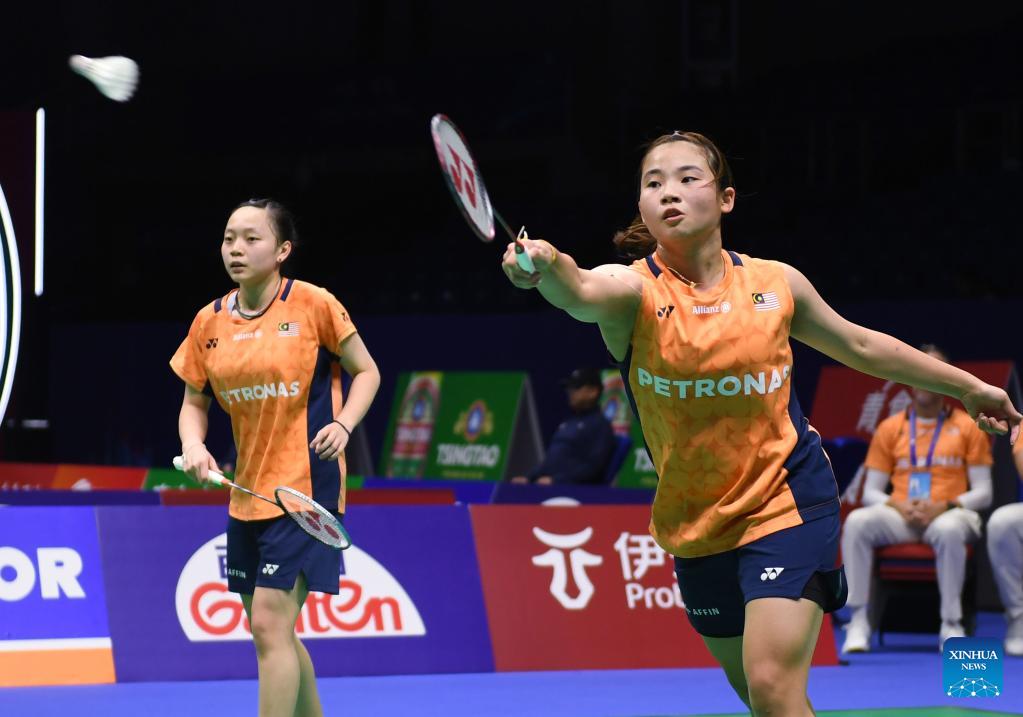 Ong Xin Yee (R)/Carmen Ting of Malaysia compete in the women's doubles match against Jia Yifan/Zhang Shuxian of China during the women's team Group W match between China and Malaysia at Badminton Asia Team Championships 2026 in Qingdao, east China's Shandong Province, Feb. 4, 2026. (Xinhua/Li Ziheng)
