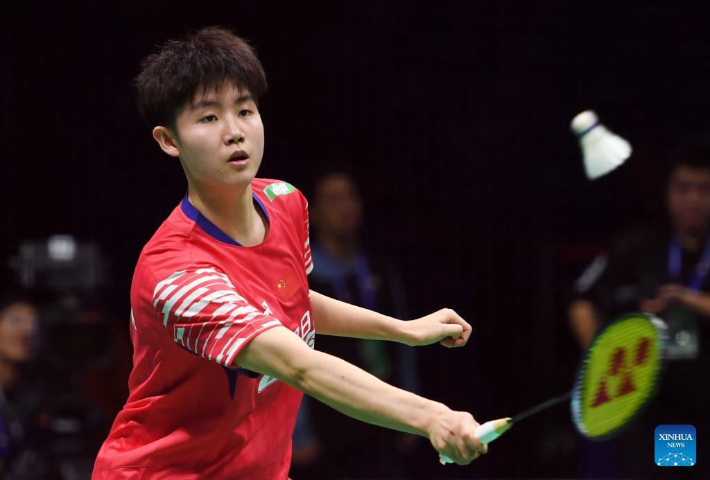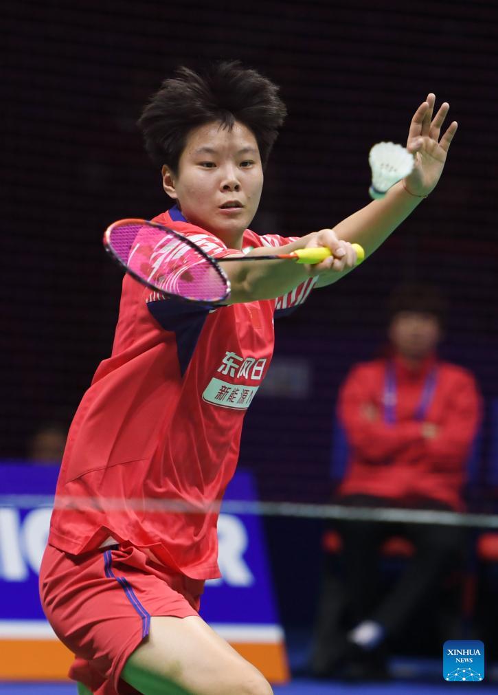 Yuan Anqi of China hits a return in the women's singles match against Oo Shan Zi of Malaysia during the women's team Group W match between China and Malaysia at Badminton Asia Team Championships 2026 in Qingdao, east China's Shandong Province, Feb. 4, 2026. (Xinhua/Li Ziheng)