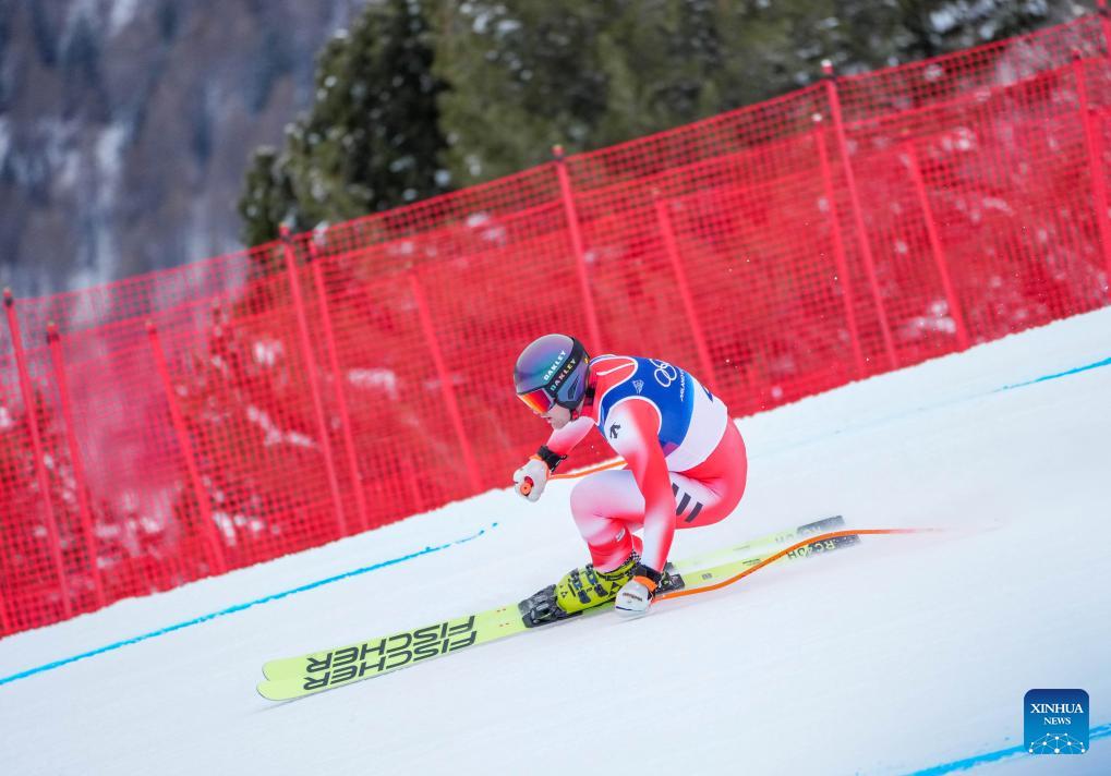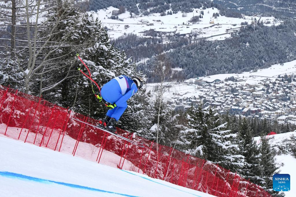 Stefan Rogentin of Switzerland takes part in the alpine skiing men's downhill first official training ahead of the 2026 Milan-Cortina Winter Olympics, in Bormio, Italy, Feb. 4, 2026. (Xinhua/Yan Linyun)