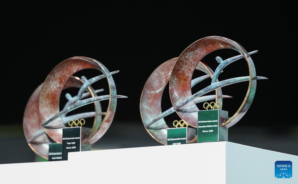 The trophies of International Olympic Committee (IOC) Climate Action Awards 2025 are seen during the announcement of the winners of Climate Action Awards 2025 by International Olympic Committee (IOC) ahead of the 2026 Milan-Cortina Winter Olympics, in Milan, Italy, Feb. 4, 2026. (Xinhua/Du Xiaoyi)