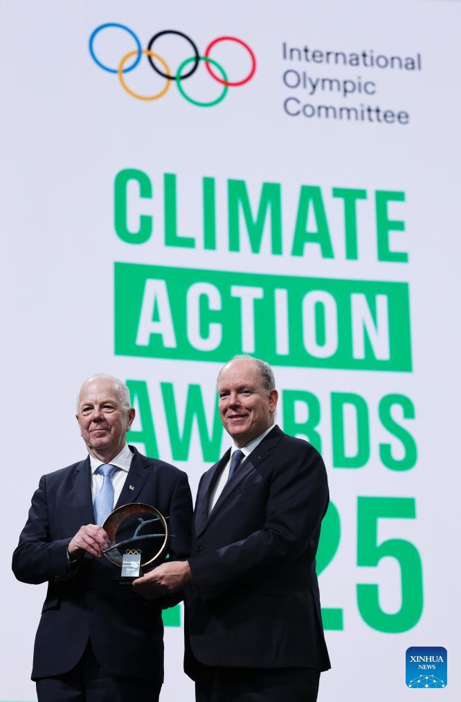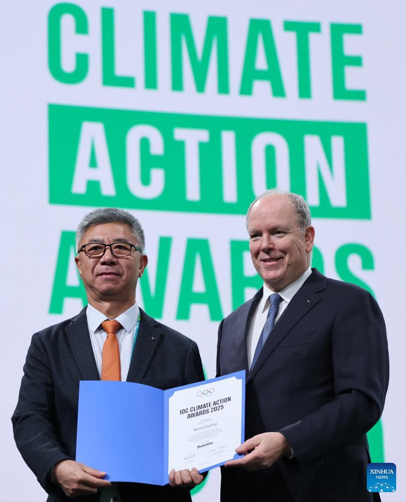 President of World Sailing, Li Quanhai (L) receives the "Highly Commended" recognition by Prince Albert II of Monaco during the announcement of the winners of Climate Action Awards 2025 by International Olympic Committee (IOC) ahead of the 2026 Milan-Cortina Winter Olympics, in Milan, Italy, Feb. 4, 2026. (Xinhua/Du Xiaoyi)