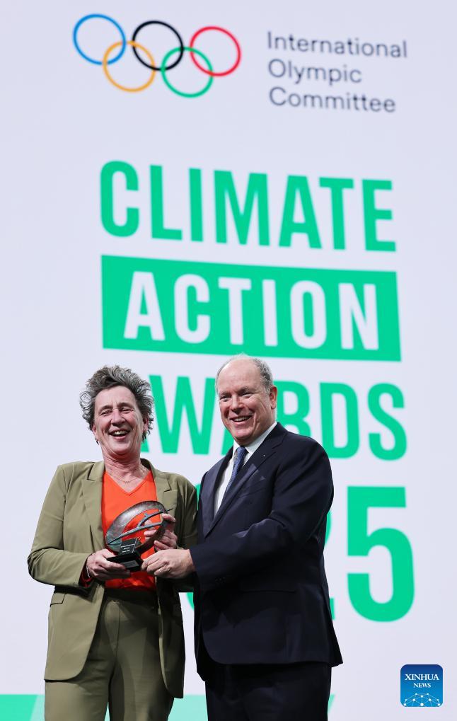 Dutch sports administrator Anneke van Zanen-Nieberg (L), representing the NOC of the Netherlands, receives the award by Prince Albert II of Monaco during the announcement of the winners of Climate Action Awards 2025 by International Olympic Committee (IOC) ahead of the 2026 Milan-Cortina Winter Olympics, in Milan, Italy, Feb. 4, 2026. (Xinhua/Du Xiaoyi)