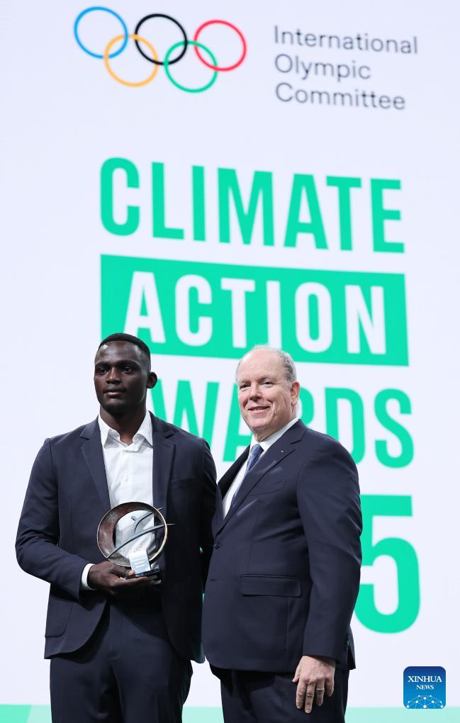 Kenya's rugby player Kevin Wekesa (L) receives the award by Prince Albert II of Monaco during the announcement of the winners of Climate Action Awards 2025 by International Olympic Committee (IOC) ahead of the 2026 Milan-Cortina Winter Olympics, in Milan, Italy, Feb. 4, 2026. (Xinhua/Du Xiaoyi)
