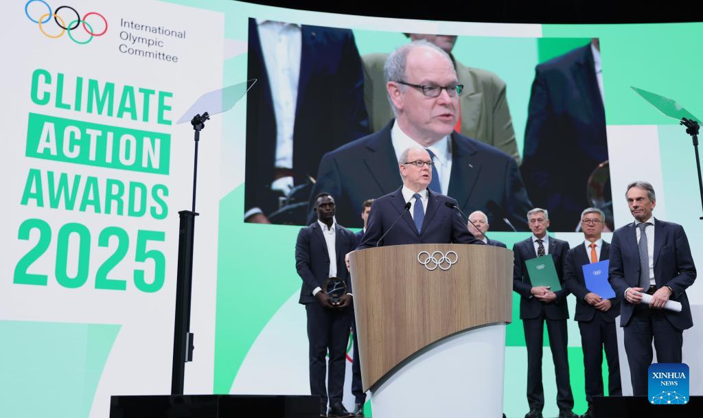 Prince Albert II of Monaco (front, L) delivers a speech during the announcement of the winners of Climate Action Awards 2025 by International Olympic Committee (IOC) ahead of the 2026 Milan-Cortina Winter Olympics, in Milan, Italy, Feb. 4, 2026. (Xinhua/Du Xiaoyi)