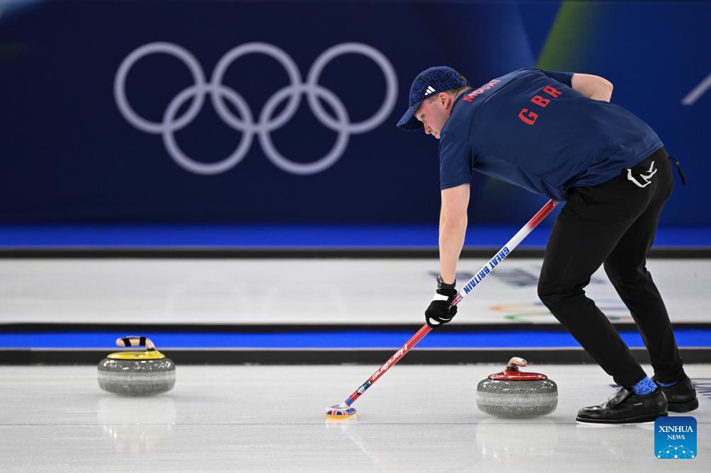 Bruce Mouat of Britain competes during the curling mixed doubles round robin session 1 match between Norway and Britain of the 2026 Milan-Cortina Winter Olympics in Cortina D'Ampezzo, Italy, Feb. 4, 2026. (Xinhua/Lian Yi)