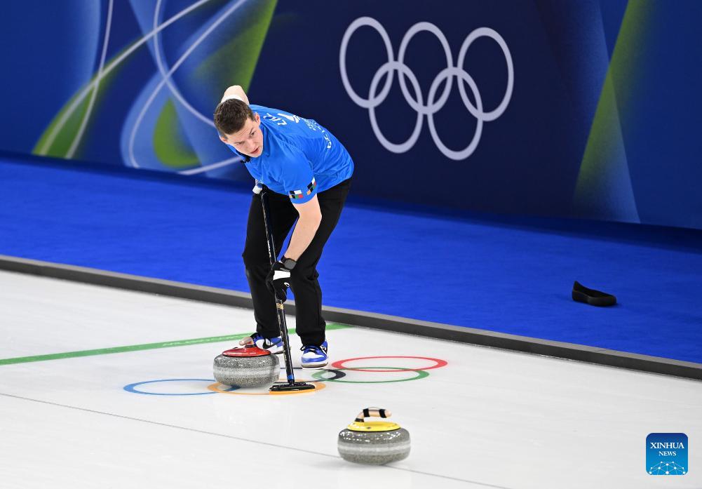 Harri Lill of Estonia competes during the curling mixed doubles round robin session 1 match between Estonia and Switzerland of the 2026 Milan-Cortina Winter Olympics in Cortina D'Ampezzo, Italy, Feb. 4, 2026. (Xinhua/Lian Yi)