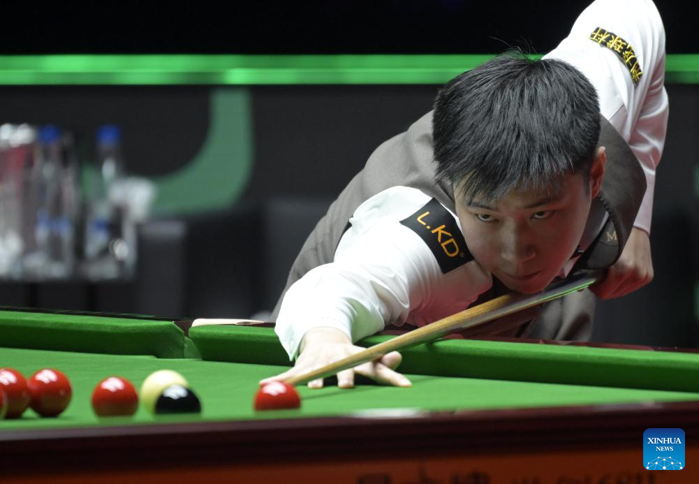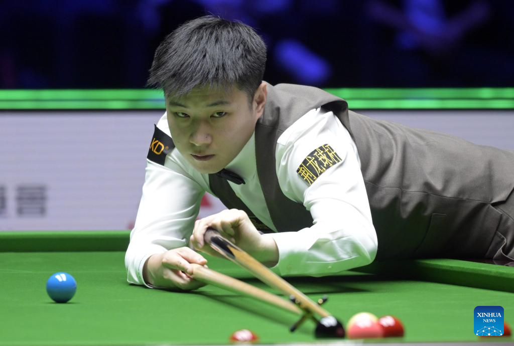 Zhao Xintong competes during the first round match between Zhao Xintong of China and John Higgins of Scotland at the Snooker World Grand Prix 2026 in Hong Kong, south China, Feb. 4, 2026. (Xinhua/Lo Ping Fai)