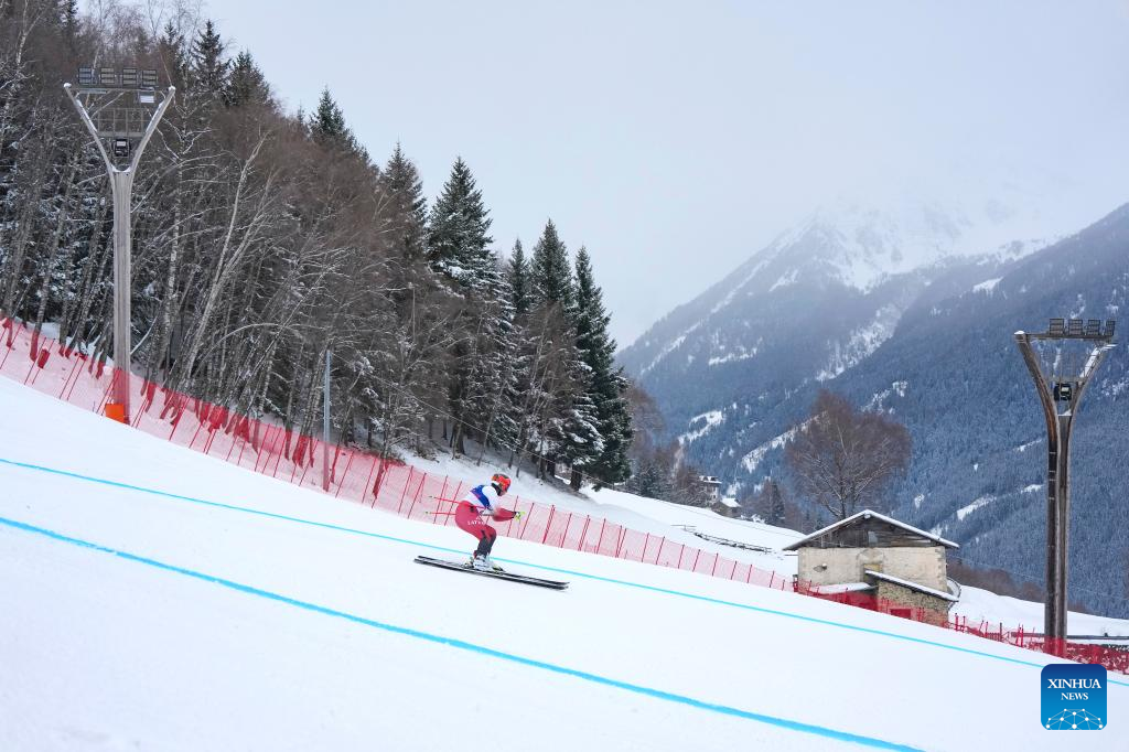 Elvis Opmanis of Latvia takes part in the alpine skiing men's downhill first official training ahead of the 2026 Milan-Cortina Winter Olympics, in Bormio, Italy, Feb. 4, 2026. (Xinhua/Hu Huhu)