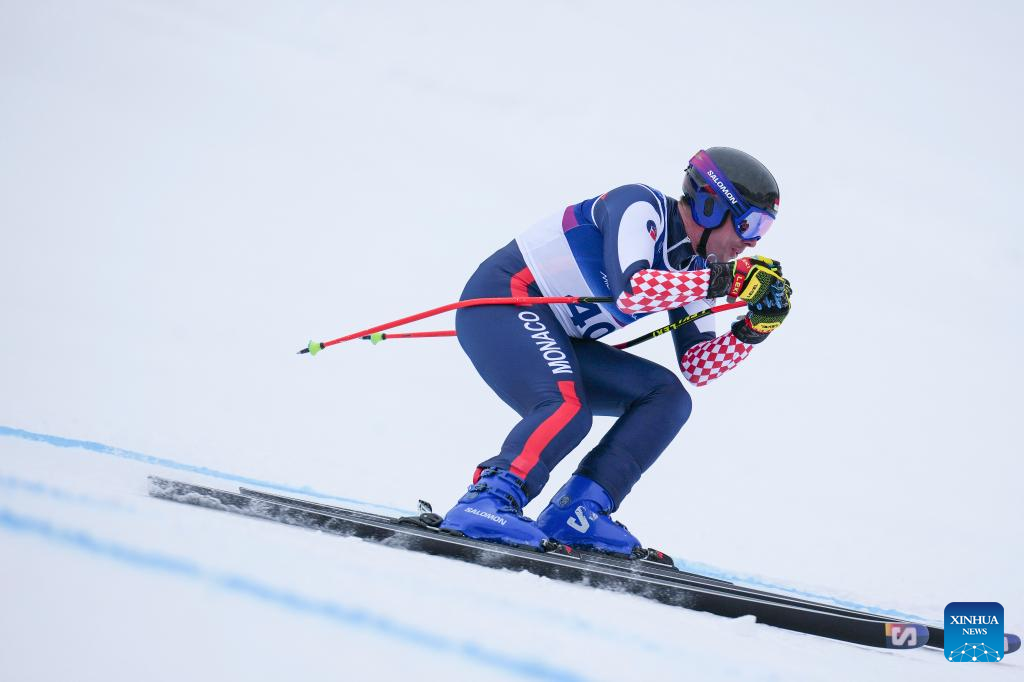 Arnaud Alessandria of Monaco takes part in the alpine skiing men's downhill first official training ahead of the 2026 Milan-Cortina Winter Olympics, in Bormio, Italy, Feb. 4, 2026. (Xinhua/Hu Huhu)