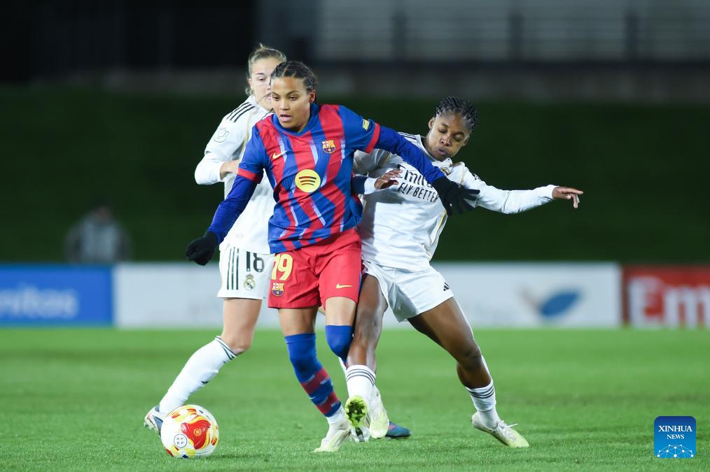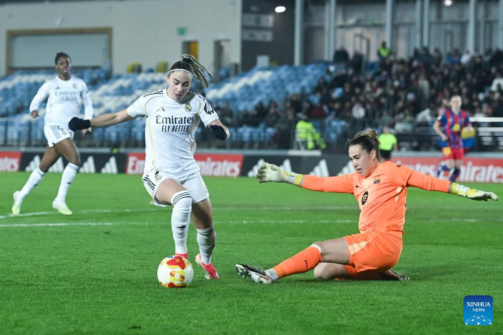 Linda Caceido (R) of Real Madrid vies with Vicky Lopez of Barcelona during the Copa de la Reina match between Real Madrid and FC Barcelona in Madrid, Spain, on Feb. 5, 2026. (Photo by Gustavo Valiente/Xinhua)