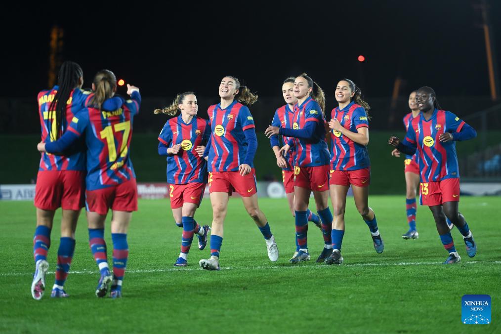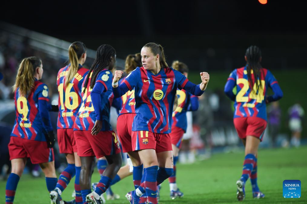 Players of Barcelona celebrate a goal during the Copa de la Reina match between Real Madrid and FC Barcelona in Madrid, Spain, on Feb. 5, 2026. (Photo by Gustavo Valiente/Xinhua)