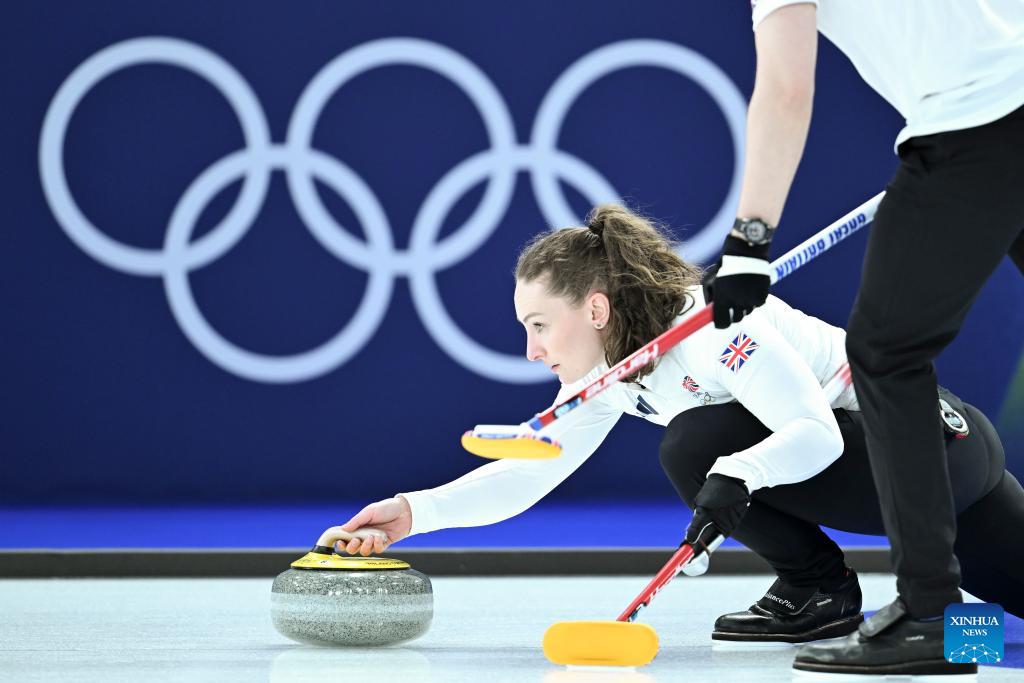 Jennifer Dodds of Britain competes during the curling mixed doubles round robin session 4 match between the Czech Republic and Britain of the 2026 Milan-Cortina Winter Olympics in Cortina D'Ampezzo, Italy, Feb. 5, 2026. (Photo: Xinhua/Lian Yi)