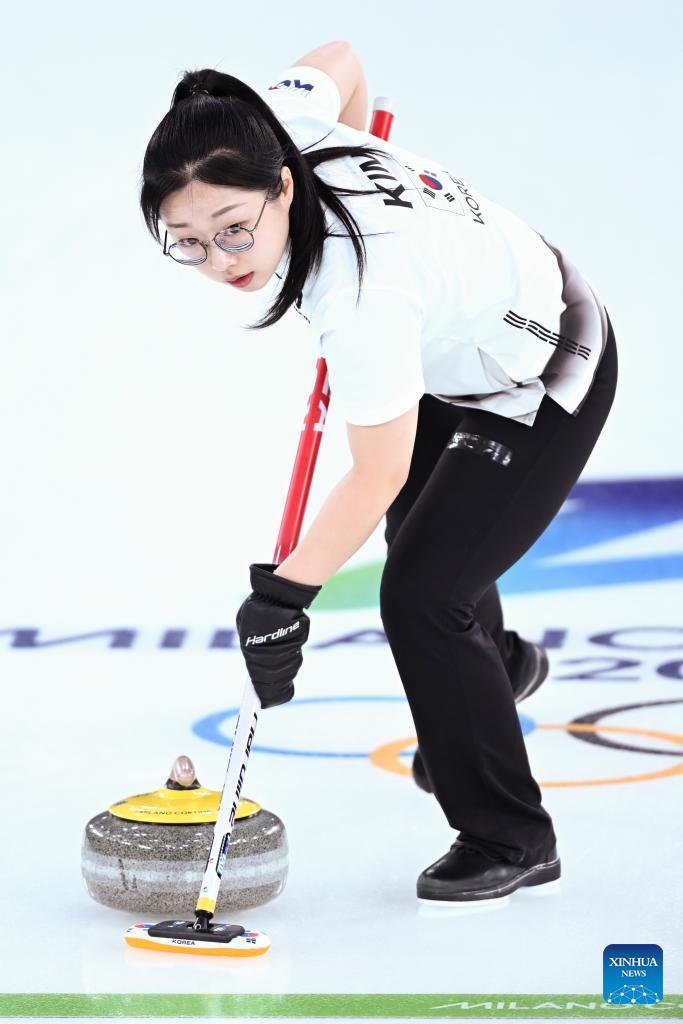 Kim Seonyeong of South Korea competes during the curling mixed doubles round robin session 4 match between South Korea and Switzerland of the 2026 Milan-Cortina Winter Olympics in Cortina D'Ampezzo, Italy, Feb. 5, 2026. (Photo: Xinhua/Lian Yi)