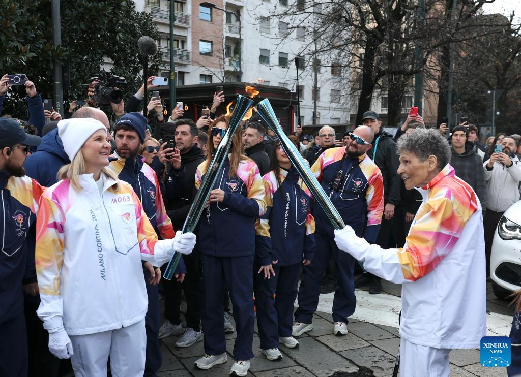 International Olympic Committee (IOC) President Kirsty Coventry (R) and Coca-Cola CEO James Quincey relay the torch during the torch relay for 2026 Milan-Cortina Winter Olympics in Milan, Italy, Feb. 6, 2026. (Photo: Xinhua/Li Jing)