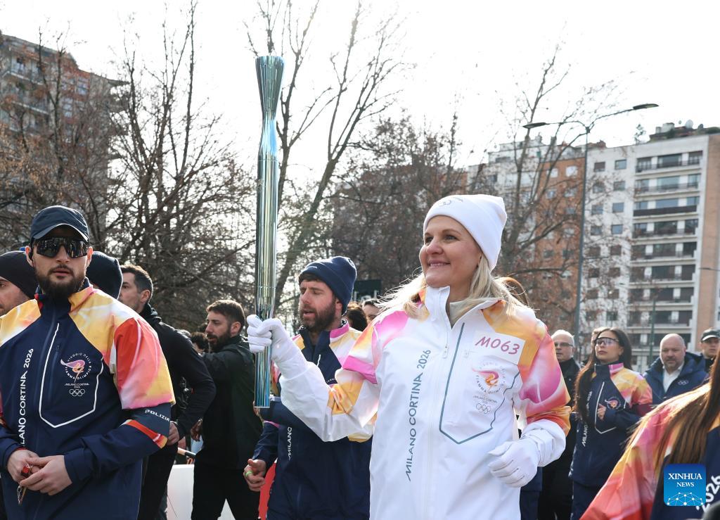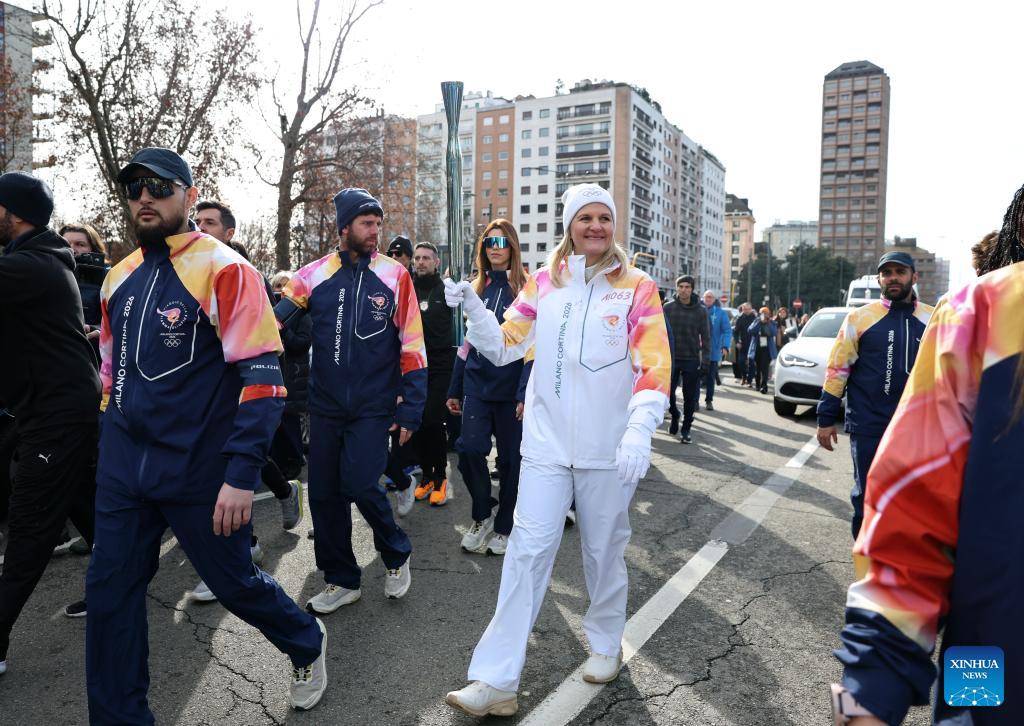 International Olympic Committee (IOC) President Kirsty Coventry holds the torch during the torch relay for 2026 Milan-Cortina Winter Olympics in Milan, Italy, Feb. 6, 2026. (Photo: Xinhua/Li Jing)