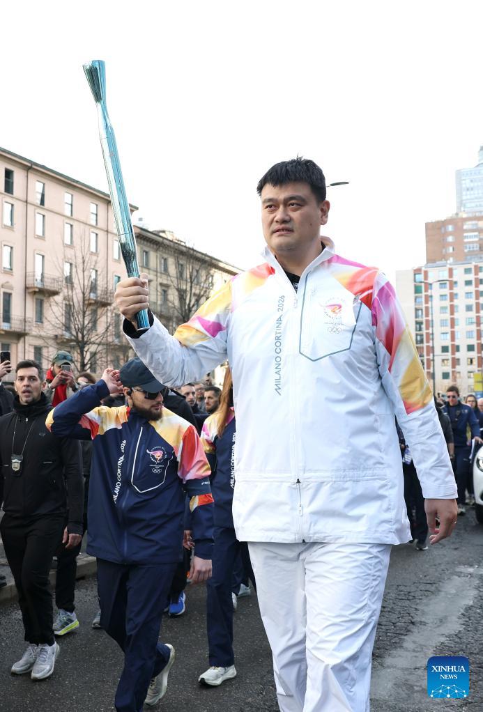 Former Chinese basketball legend Yao Ming relays the torch during the torch relay for 2026 Milan-Cortina Winter Olympics in Milan, Italy, Feb. 6, 2026. (Photo: Xinhua/Li Jing)
