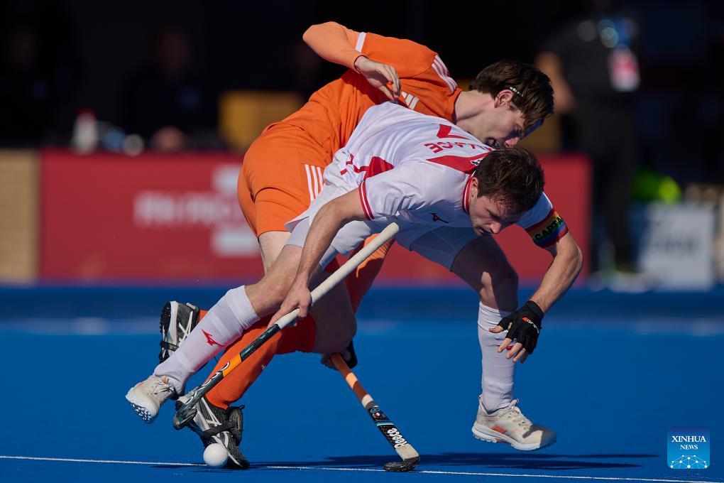 James Mazarelo (L) of England vies with Thijs van Dam of the Netherlands during the FIH Hockey Pro League men's match between England and the Netherlands in Valencia, Spain, Feb. 6, 2026. (Photo by Pablo Morano/Xinhua)