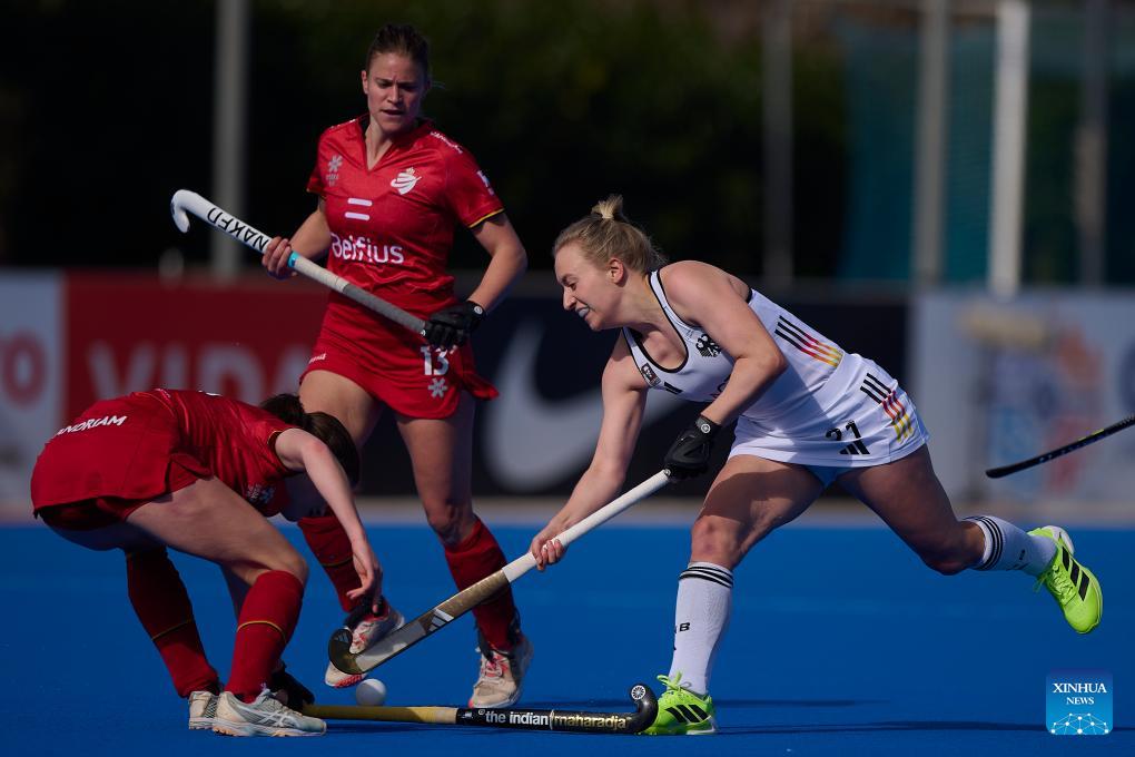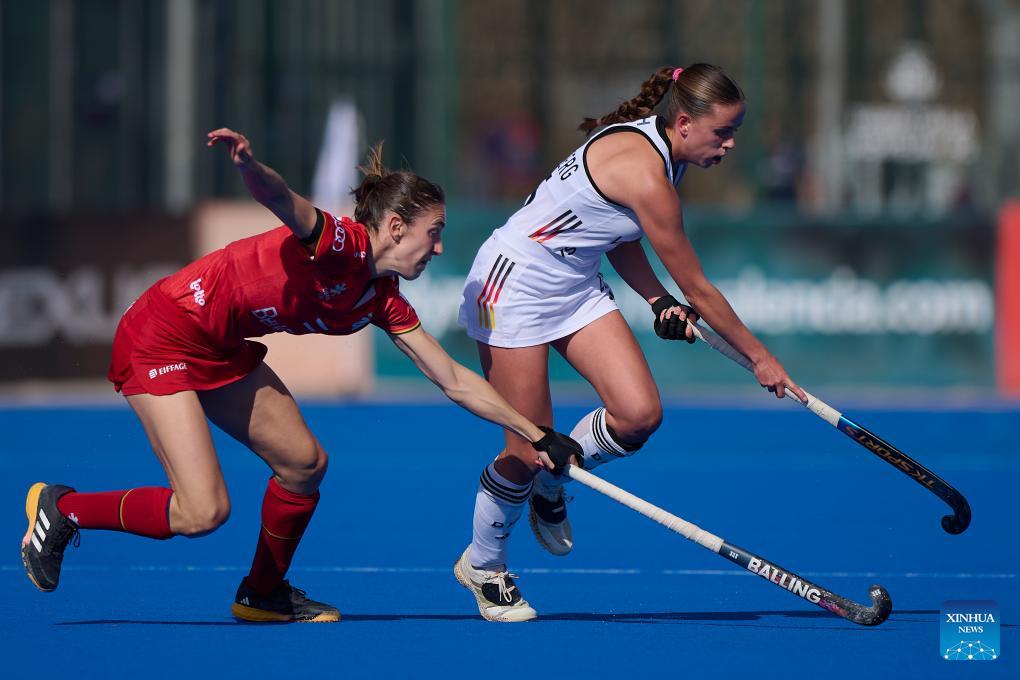 Johanna Hachenberg (R) of Germany vies with Judith Vandermeiren of Belgium during the FIH Hockey Pro League women's match between Germany and Belgium in Valencia, Spain, Feb. 6, 2026. (Photo by Pablo Morano/Xinhua)