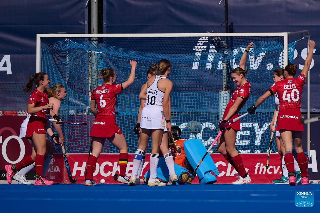 Players of Belgium celebrate a goal during the FIH Hockey Pro League women's match between Germany and Belgium in Valencia, Spain, Feb. 6, 2026. (Photo by Pablo Morano/Xinhua)