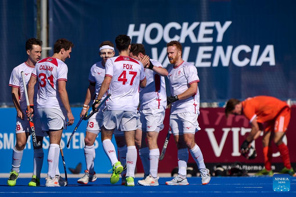 Players of England celebrate a goal during the FIH Hockey Pro League men's match between England and the Netherlands in Valencia, Spain, Feb. 6, 2026. (Photo by Pablo Morano/Xinhua)