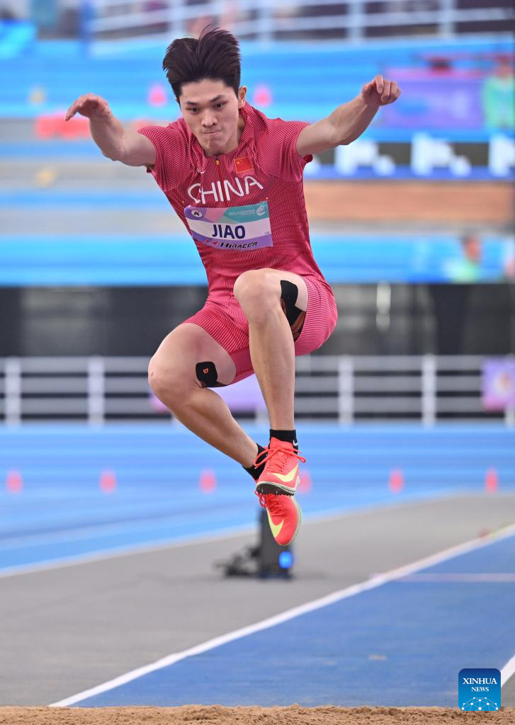 China's Jiao Xinping competes during the men's triple jump final at the 12th Asian Indoor Athletics Championships 2026 in Tianjin, north China, Feb. 6, 2026. (Xinhua/Li Ran)