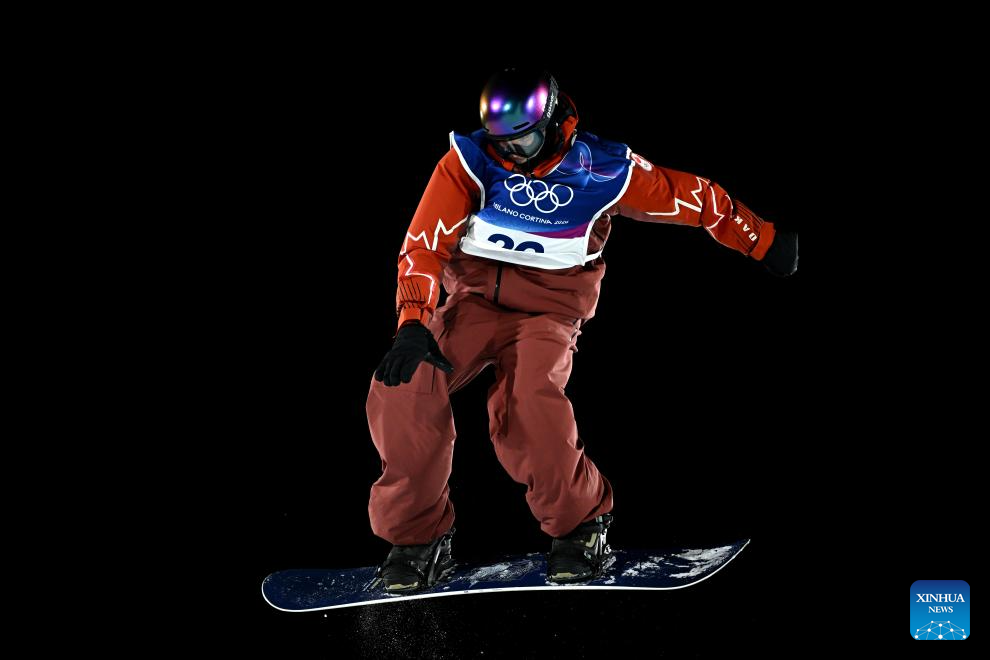 Francis Jobin of Canada competes during the Snowboard Men's Big Air qualification of the Milan-Cortina 2026 Olympic Winter Games in Livigno, Italy, Feb. 5, 2026. (Xinhua/Zhang Hongxiang)