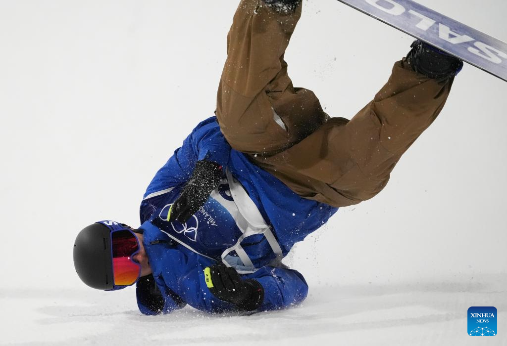 Noah Vicktor of Germany falls during the Snowboard Men's Big Air qualification of the Milan-Cortina 2026 Olympic Winter Games in Livigno, Italy, Feb. 5, 2026. (Xinhua/Wu Huiwo)