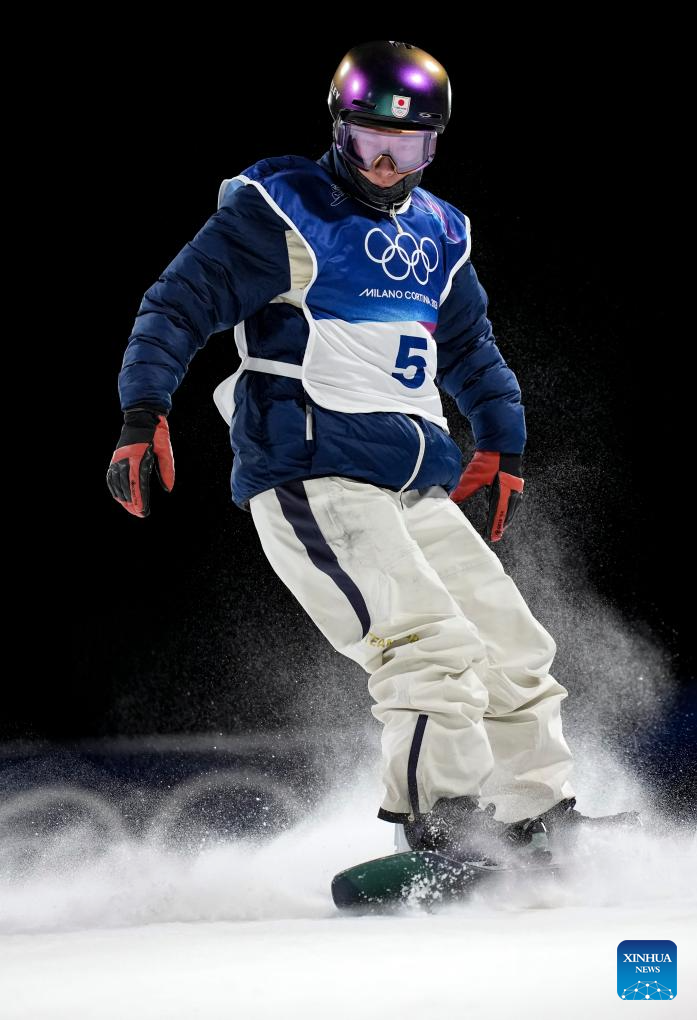 Kimura Kira of Japan competes during the Snowboard Men's Big Air qualification of the Milan-Cortina 2026 Olympic Winter Games in Livigno, Italy, Feb. 5, 2026. (Xinhua/Xia Yifang)