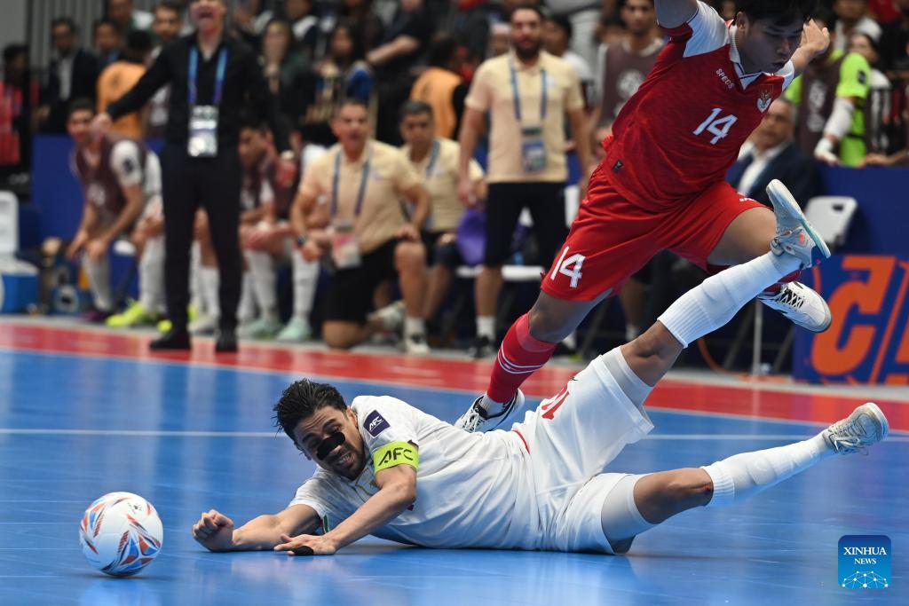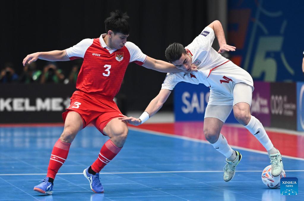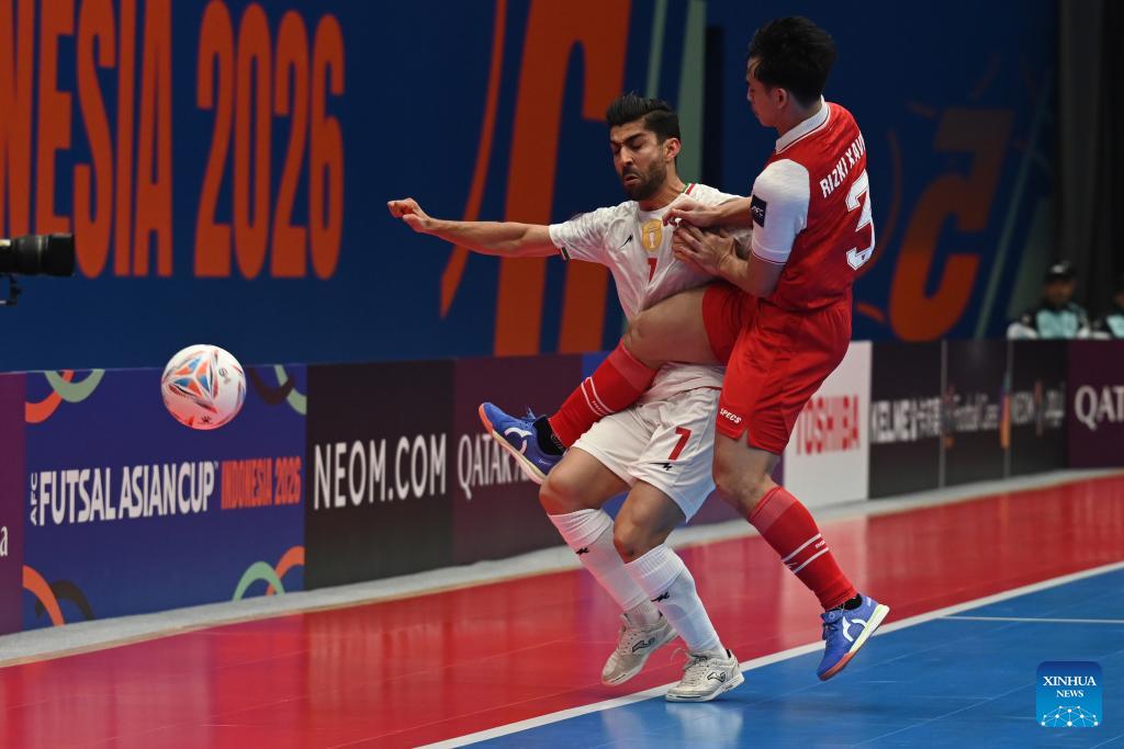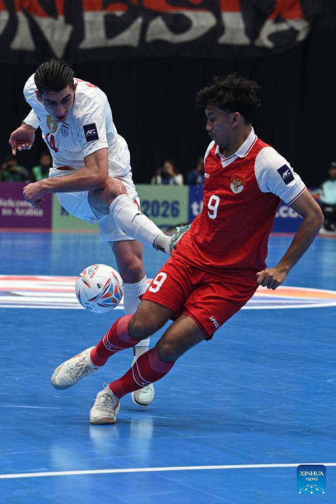 Hossein Tayebibidgoli (L) of Iran vies with Yogi Saputra of Indonesia during the final match between Indonesia and Iran at the AFC Futsal Asian Cup 2026 in The Indonesia Arena stadium, Jakarta, Indonesia, Feb. 7, 2026. (Xinhua/Agung Kuncahya B.)