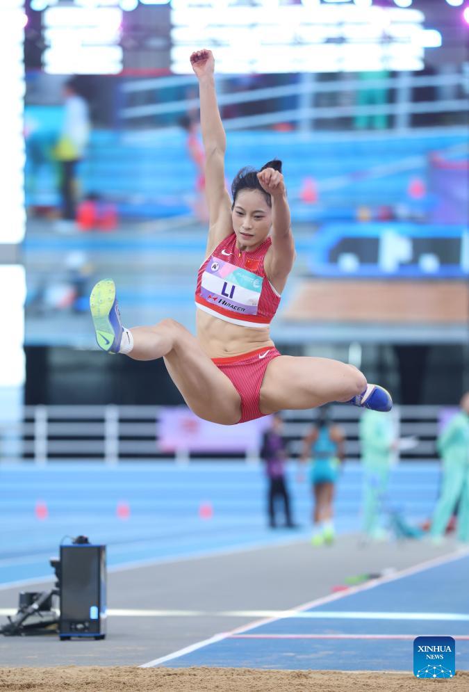 Li Zhishuang of China competes during the women's long jump final at the 12th Asian Indoor Athletics Championships 2026 in Tianjin, north China, Feb. 8, 2026. (Xinhua/Sun Fanyue)