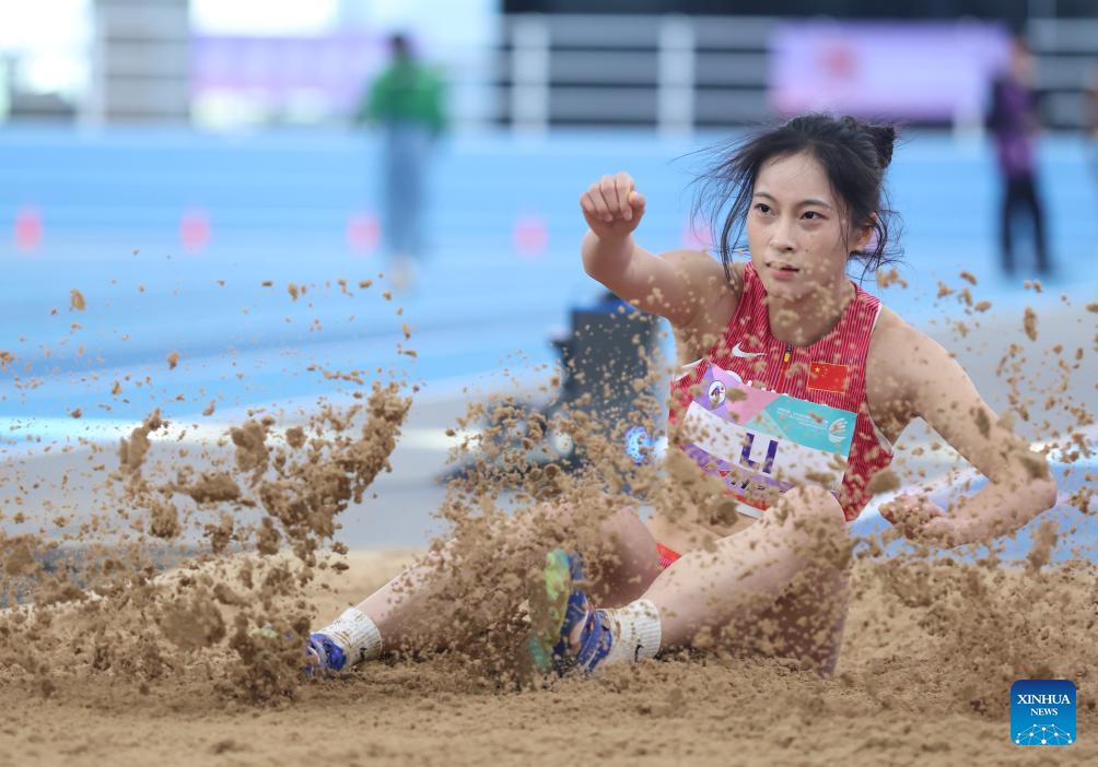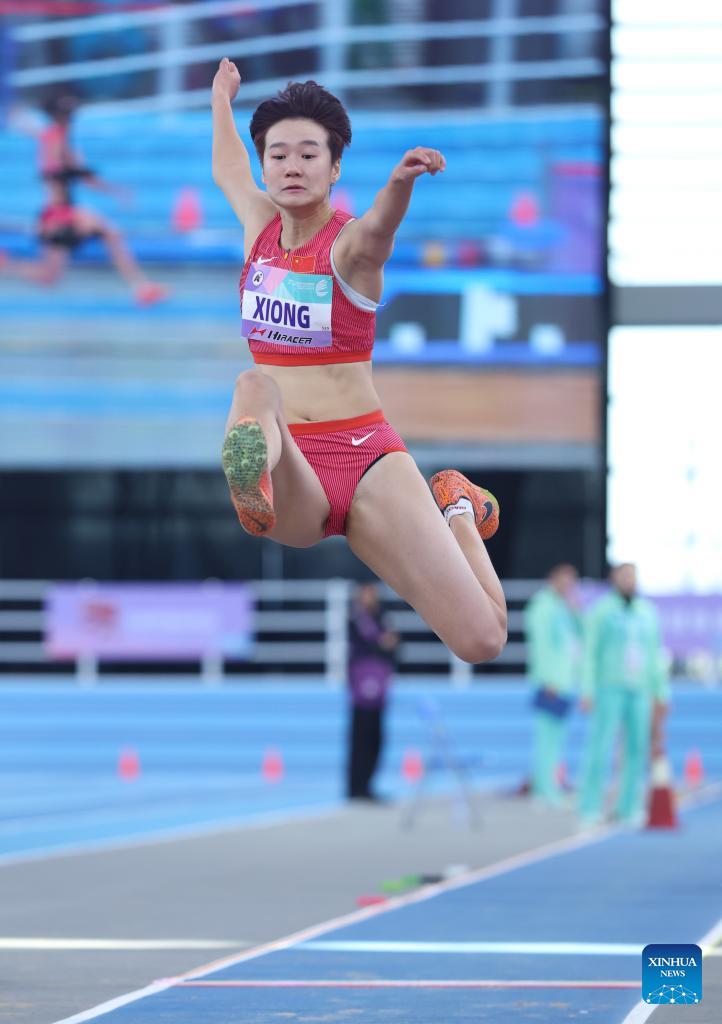 Xiong Shiqi of China competes during the women's long jump final at the 12th Asian Indoor Athletics Championships 2026 in Tianjin, north China, Feb. 8, 2026. (Xinhua/Sun Fanyue)