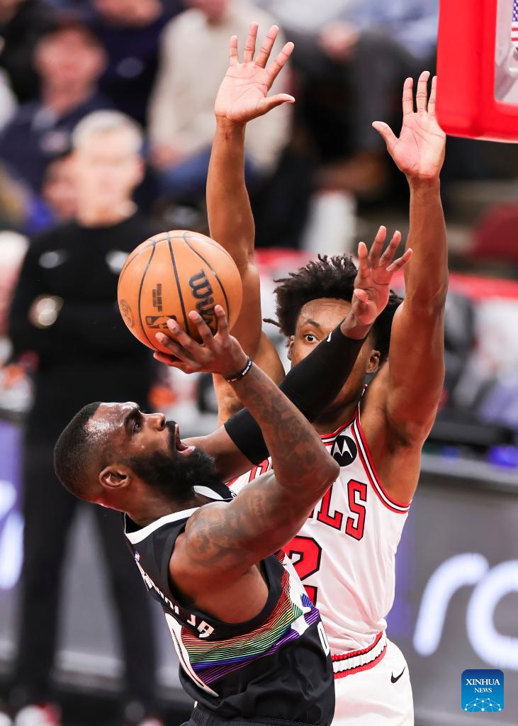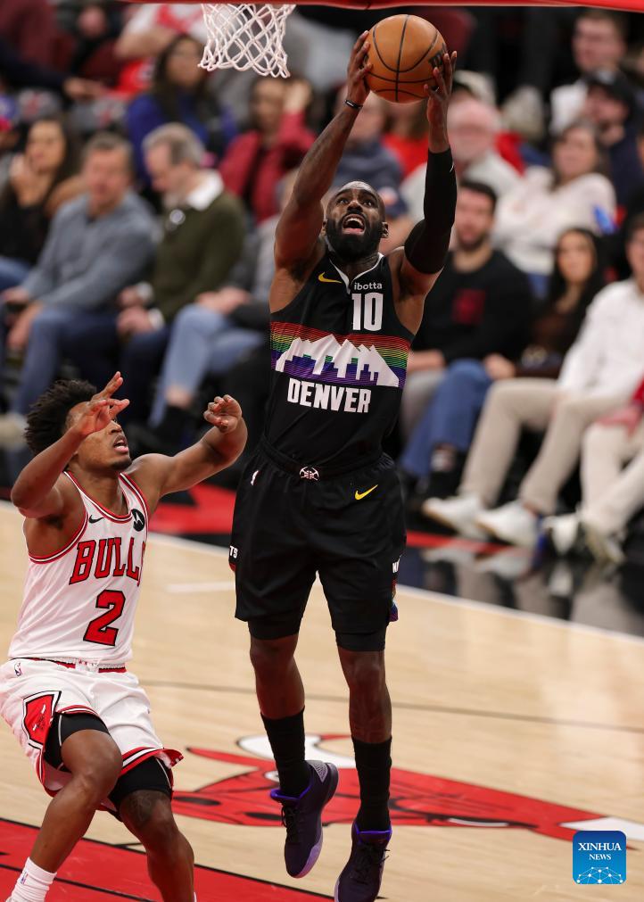 Denver Nuggets' Tim Hardaway Jr. (R) drives to the basket during the NBA regular season game between Denver Nuggets and Chicago Bulls at United Center in Chicago, the United States, Feb. 7, 2026. (Photo by Joel Lerner/Xinhua)